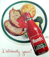 Where modern ketchup is a very thick sweet and sour chutney of tomatoes, ketchup from about 1750-1850 mainly meant a thin dark sauce made of fermented walnuts or sometimes fermented mushrooms. Mushroom ketchup is still produced by old-fashioned grocers; here's a bottle: